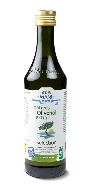 Entdecke das preisgekrönte MANI native Olivenöl extra, Selection – jetzt in der wiederverwendbaren 0,5 l Pfandflasche. Naturland Fair zertifiziert, ökologisch, sozial und ressourcenschonend verpackt – für bewussten Genuss und weniger Verpackungsmüll.