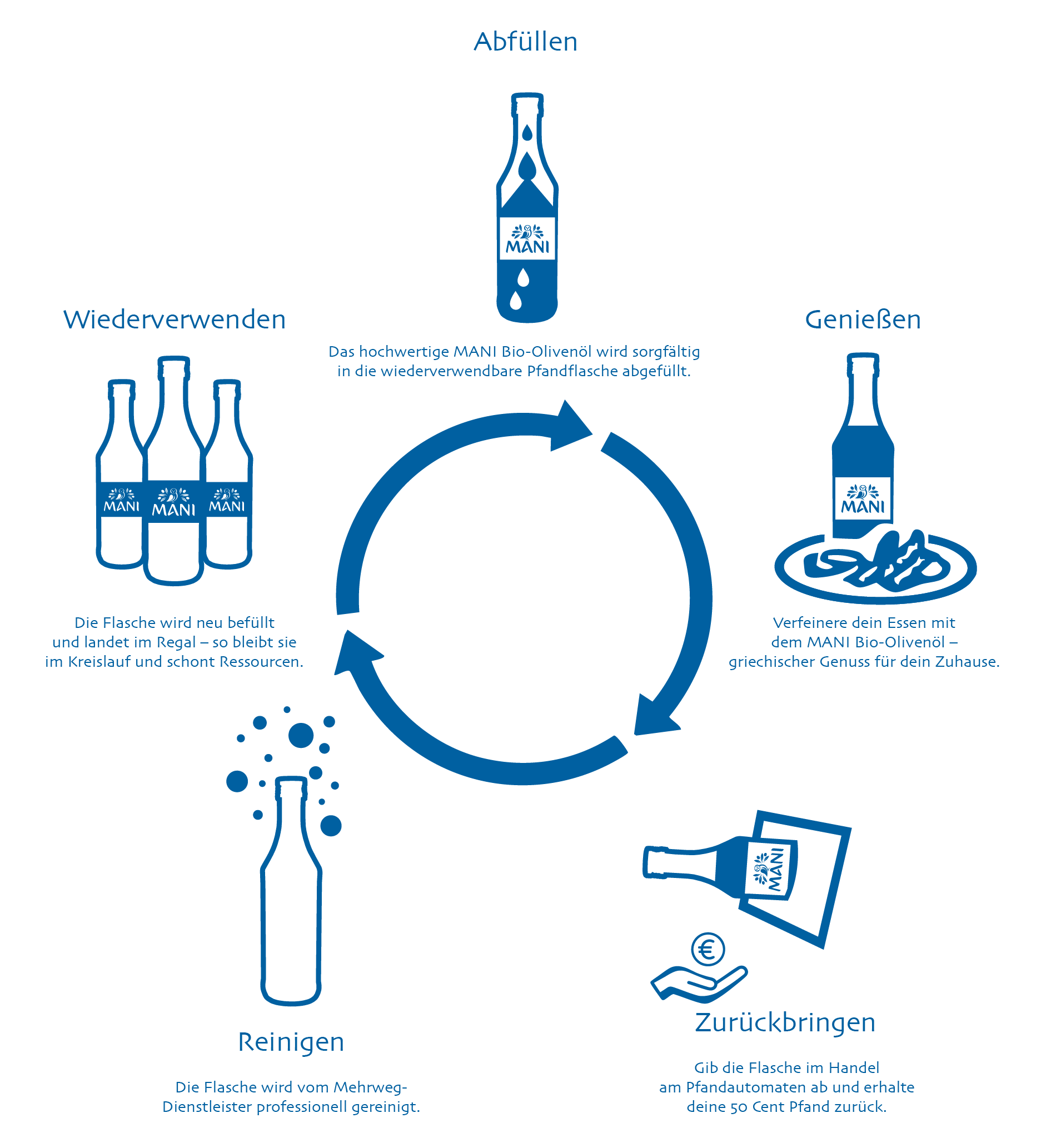 Durch die Abfüllung in einer wiederverwendbaren Flasche und die Teilnahme am Mehrweg-System von dotch spart MANI Bläuel bis zu 50 % CO₂ im Vergleich zu Einwegverpackungen ein. Die robuste Standardflasche ist dabei 20 % leichter als herkömmliche Ölflaschen und kann bis zu 50-mal wiederverwendet werden.